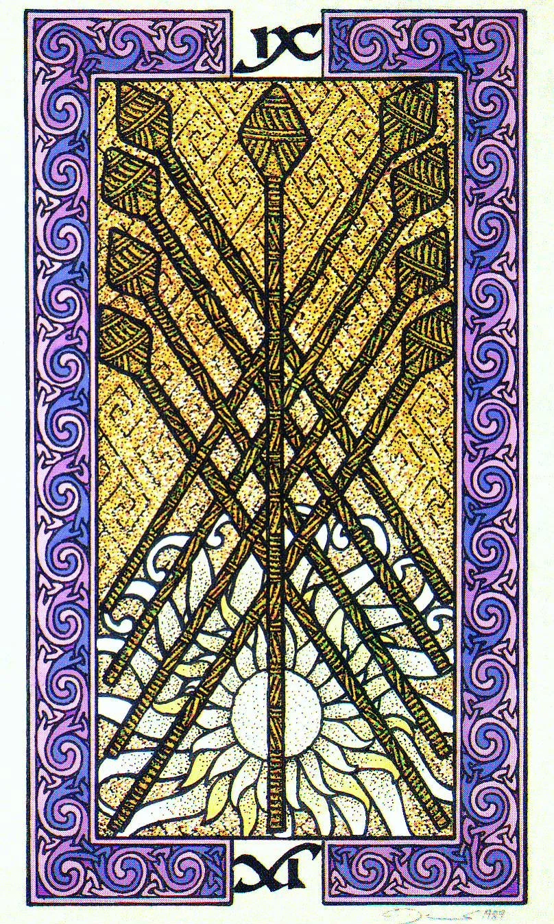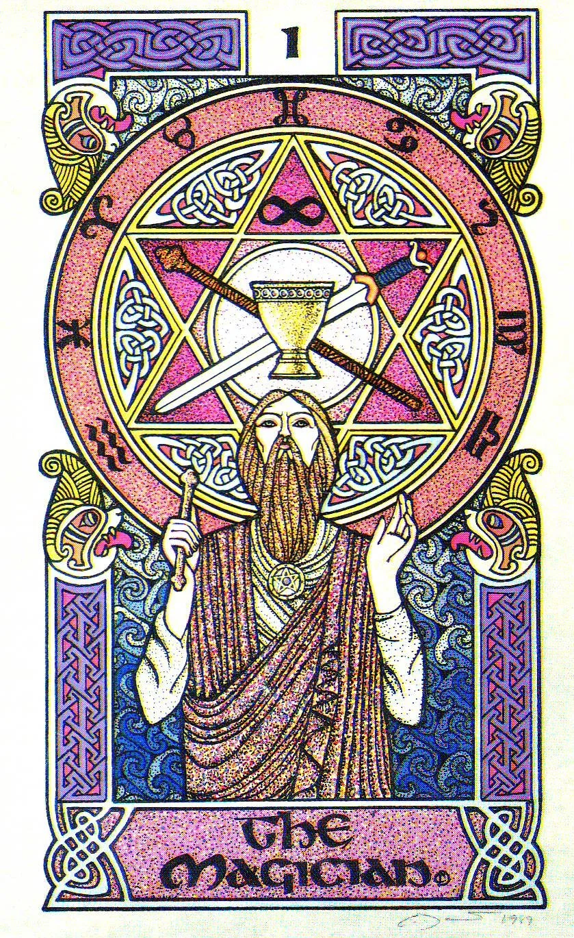 Having said that, this Celtic Tarot is beautifully illustrated in a style similar to that used in The Book of Kells and the Lindisfarne gospels, which Davis mixes with other Celtic styles such as La-Tène. The Major Arcana are richly bedizened in Celtic and Arthurian heroes, heroines and warriors, fitted into the roles of the cards. Here we encounter Arthur (The Emperor) and Merlin (The Hermit), with Danu playing the role of Justice, Covetina starring as The Star, Cuchulain riding The Chariot, and so on. While the deck follows the Rider-Waite standard, it is difficult to use for some aspects of reading, such as reversed cards, as the Pip cards do not allow for that type of use, so not really a deck for Beginners, although experienced cartomancers will be able to draw insights from the scenes of the Major Arcana and Court cards.