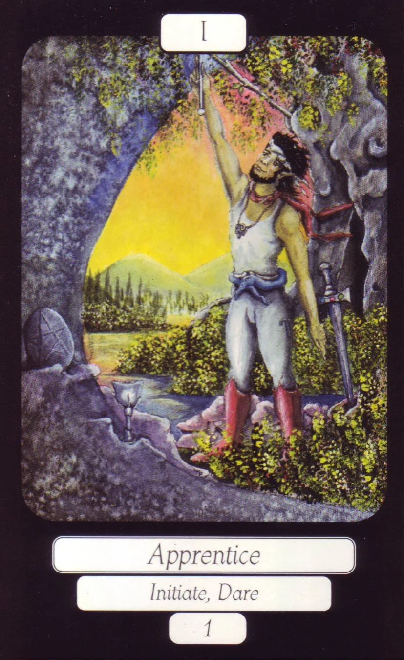 The artwork of the Merry Day deck is truly wonderful - a much gentler display of the RWS iconography, as one reviewer puts it. It certainly is much more colourful and imagination-filled than many other decks. The realms portrayed are definitely more on the Faerie side of things, as J. R. R. Tolkien would have described it, filled with vibrant landscapes and mythical creatures, not to mention mythical races, perhaps. In any case, the scenes are vivid and enrapturing, taking you beyond those of the basic RWS deck. Plus, many of the denizens portrayed, when not other-worldly derived, seem to come from the hippies and heads of the late 1960’s and early 1970’s era, adding to the Flower Power mythos that tried to save a doomed world from the horrors of war and imminent mass destruction. The Apprentice (Magician) card to the left and the Student (Chariot) card below are prime examples of that motif.